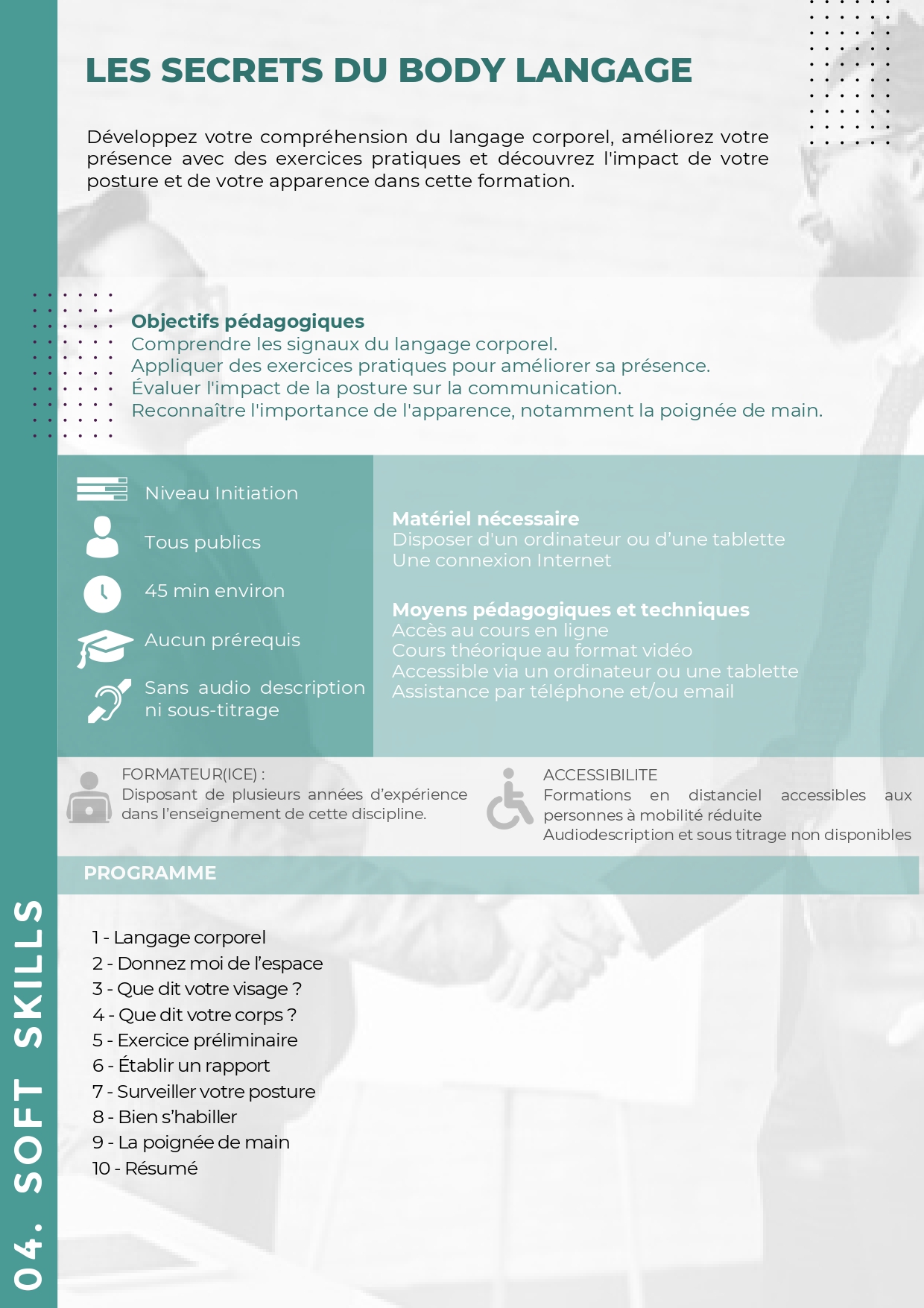 Développez votre compréhension du langage corporel, améliorez votre présence avec des exercices pratiques et découvrez l’impact de votre posture et de votre apparence dans cette formation.