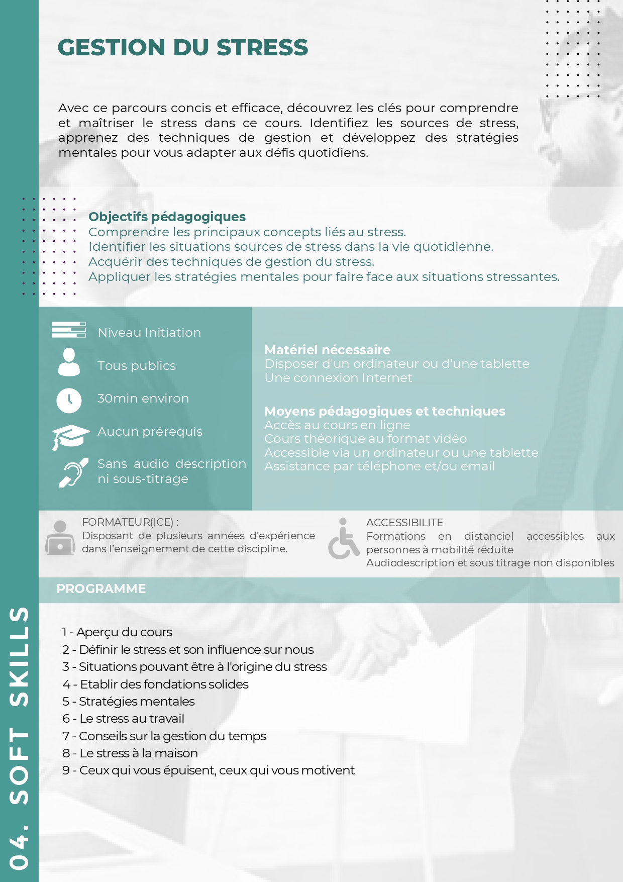 Avec ce parcours concis et efficace, découvrez les clés pour comprendre et maîtriser le stress dans ce cours. Identifiez les sources de stress, apprenez des techniques de gestion et développez des stratégies mentales pour vous adapter aux défis quotidiens.