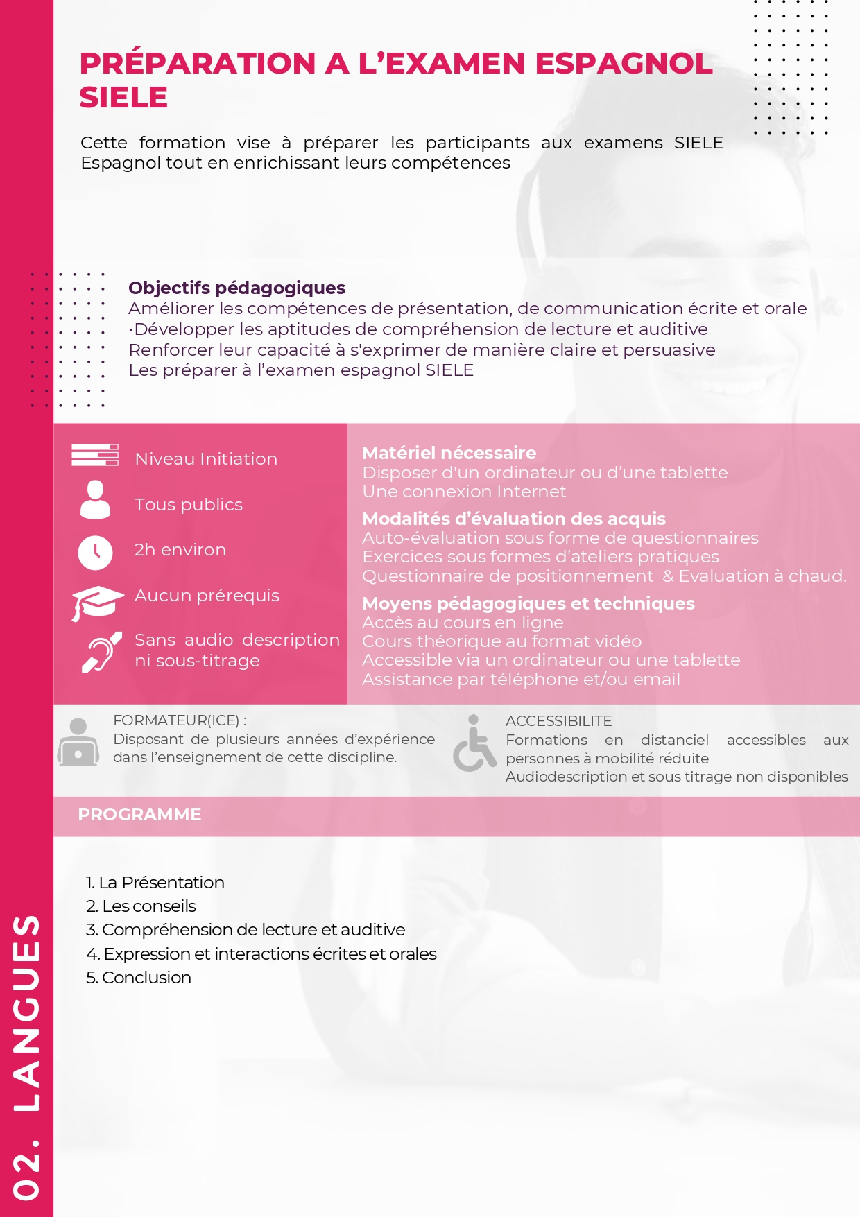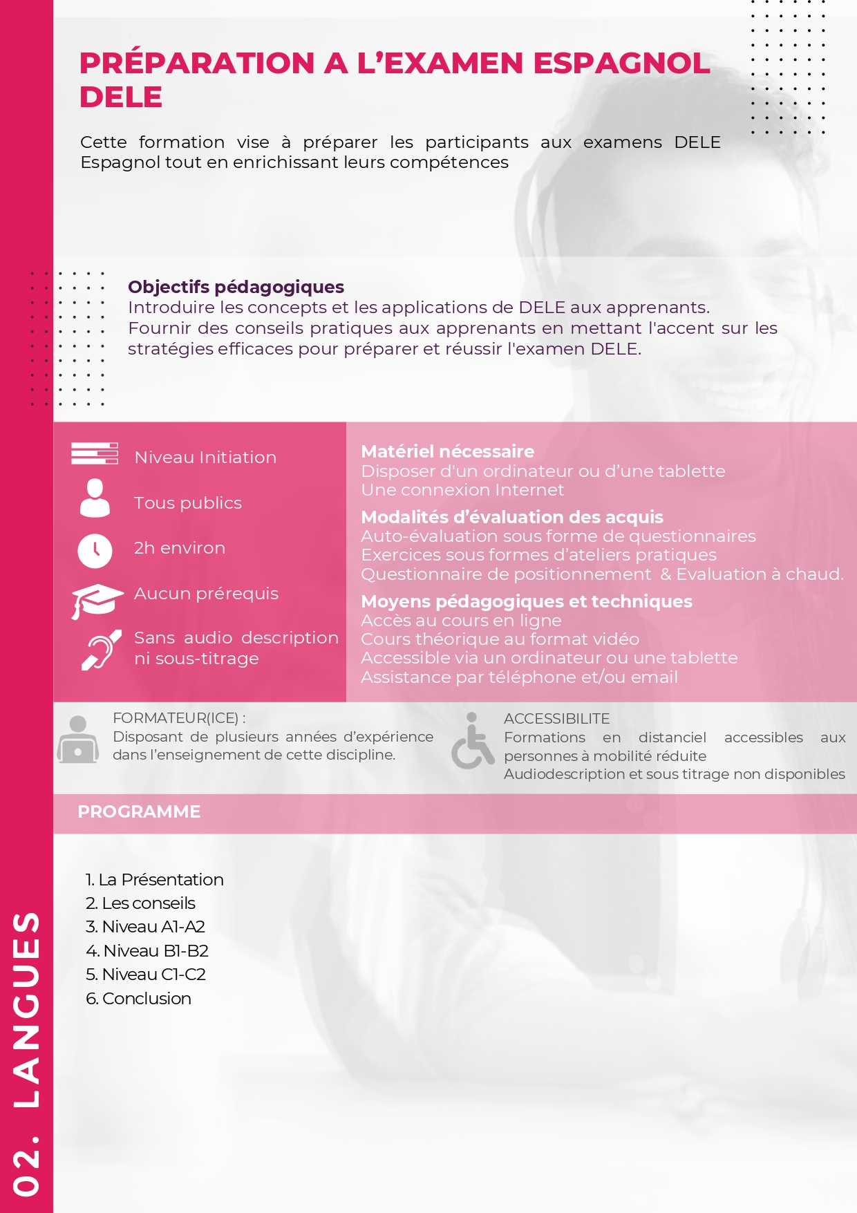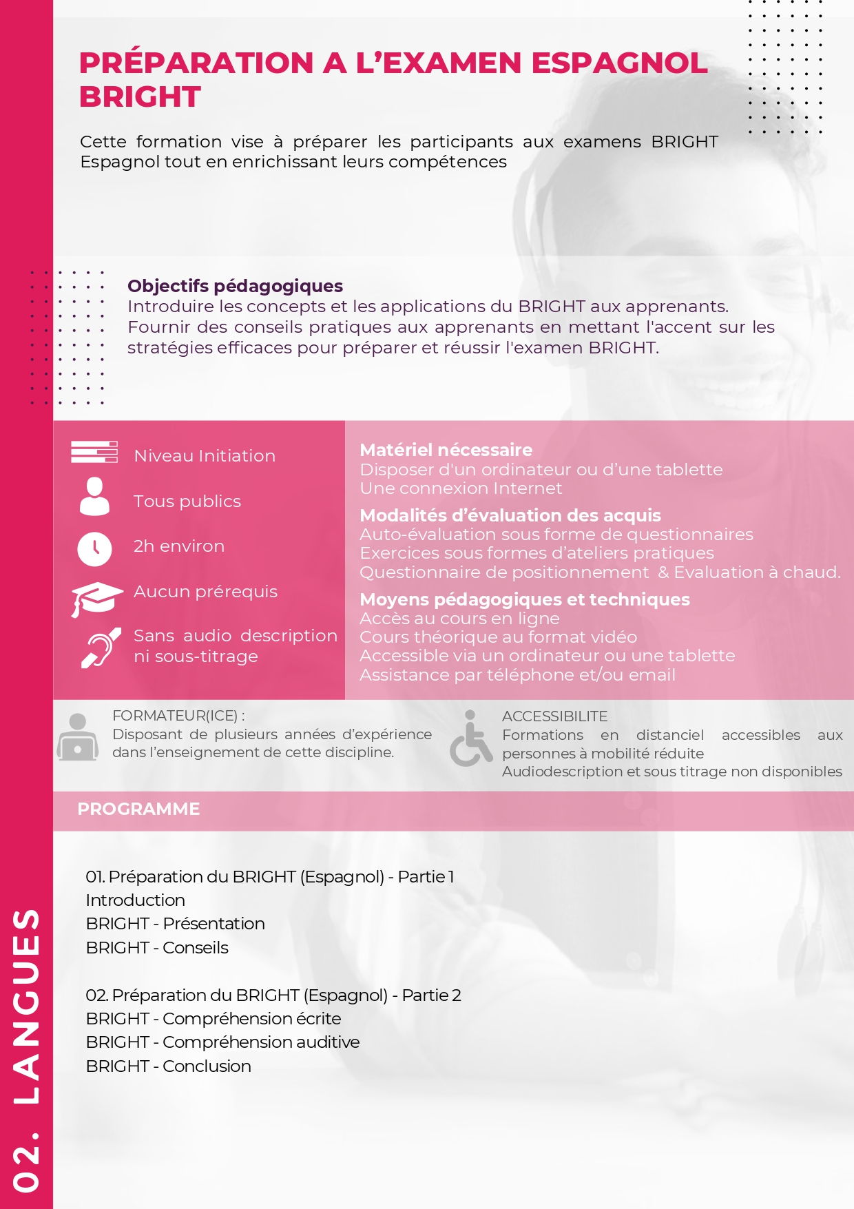 Ces formations de 2 heures visent à préparer les participants aux examens DELE, BRIGHT ou SIELE Espagnol tout en enrichissant leurs compétences.