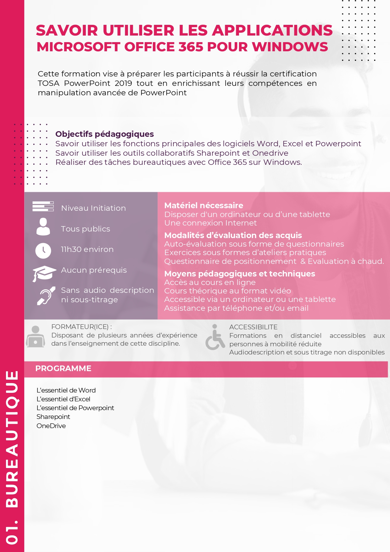 Savoir utiliser les fonctions principales des logiciels Word, Excel et Powerpoint, savoir utiliser les outils collaboratifs Sharepoint et Onedrive, réaliser des tâches bureautiques avec Office 365 sur Windows.