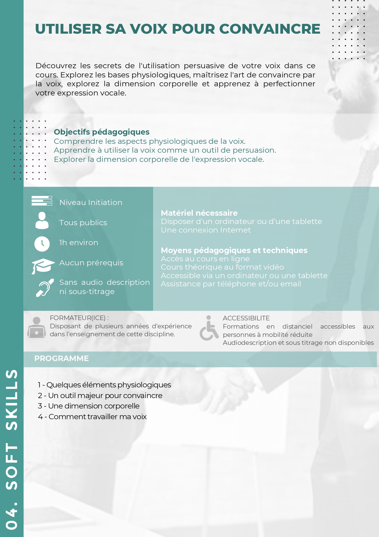 Découvrez les secrets de l’utilisation persuasive de votre voix dans ce cours. Explorez les bases physiologiques, maîtrisez l’art de convaincre par la voix, explorez la dimension corporelle et apprenez à perfectionner votre expression vocale.