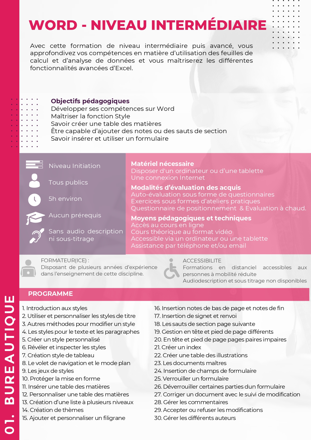 Avec cette formation de niveau intermédiaire, vous approfondivez vos compétences en maîtrisant la fonction Style, la création d’une table des matières, ajouter des notes ou des sauts de section, savoir insérer et utiliser un formulaire